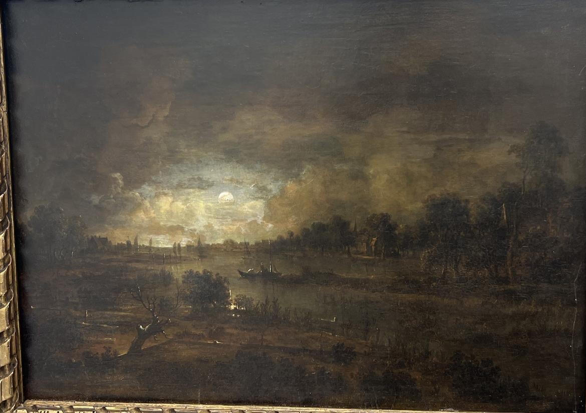 Comme dans chacune des oeuvres de Van der Neer, on retrouve quelques sujets d’agrément autour des 2 axes centraux de ses compositions qui sont la rivière et le ciel, toujours chargé et en combat éternel avec les reflets de lune qui ici lui octroient quelques soupçons de bleu et de jaune