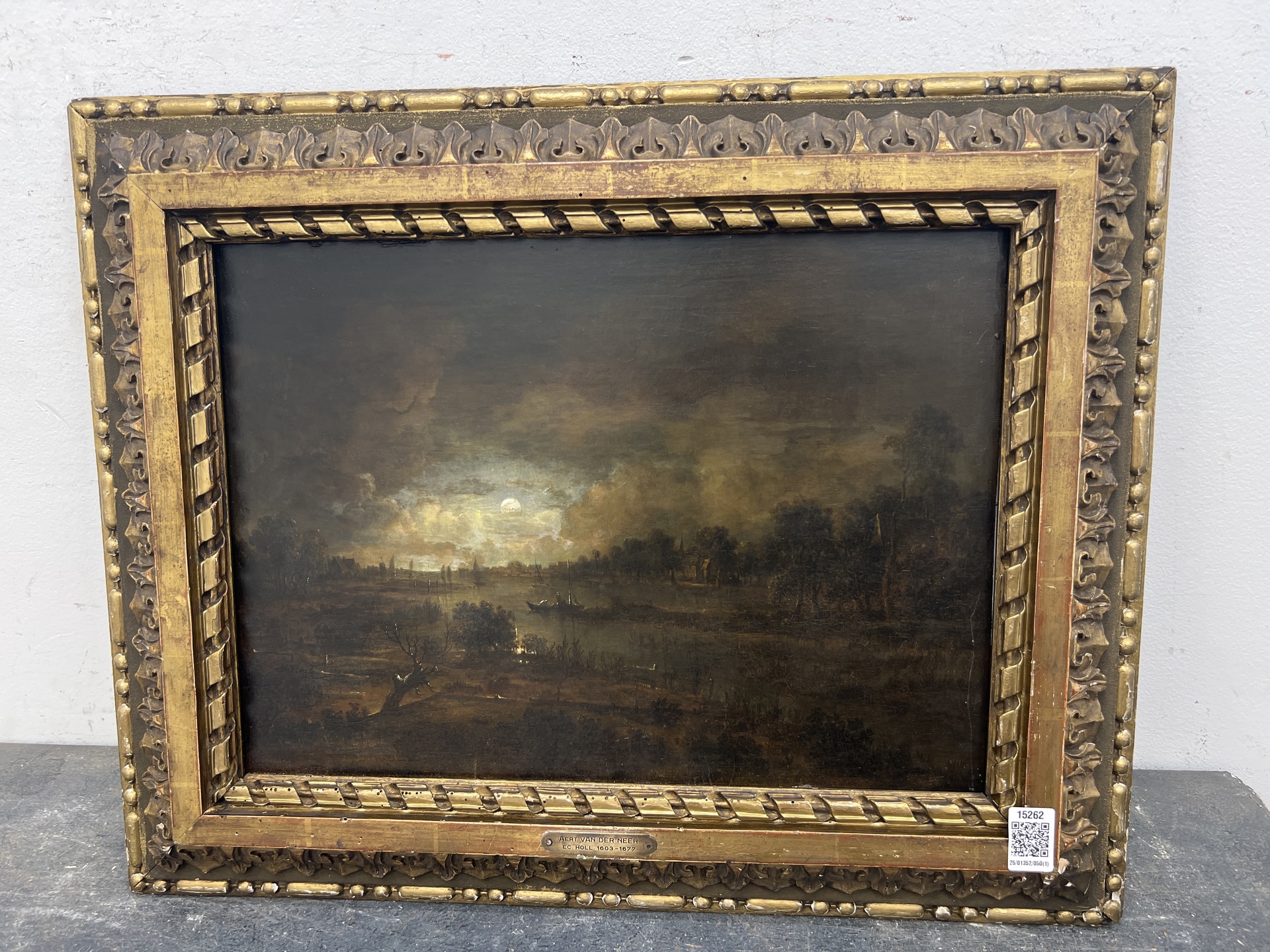 Il s’agit d’une reprise (copie avec variante) d’une œuvre dénommée Het Poontever (passage du bac) datant de 1655 et exposée au Rijksmuseum d’Amsterdam. 82,5×105,5cm.